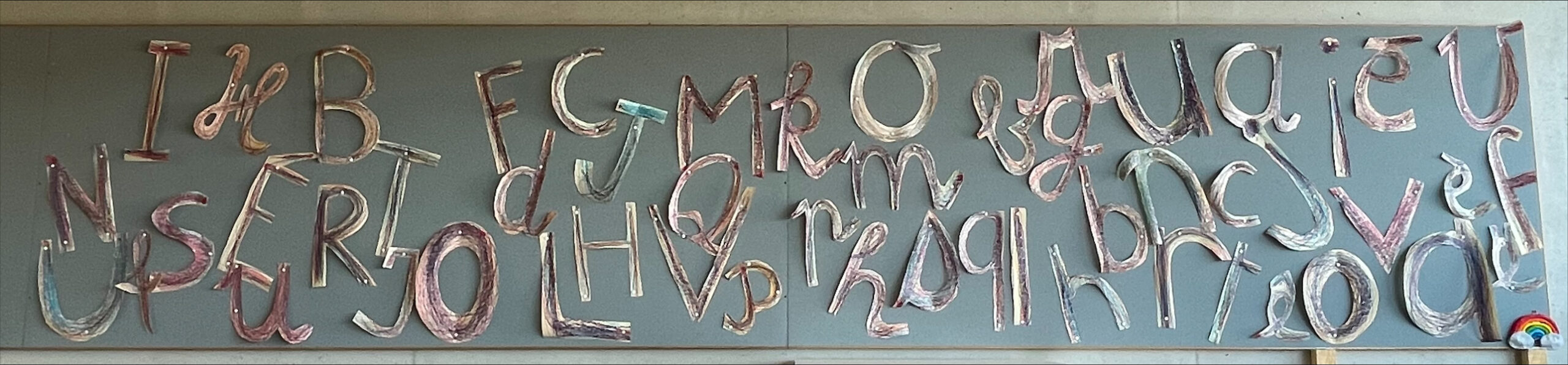 Voici quelques lettres géantes qui ont permis aux élèves de maîtriser le geste en motricité globale avant de l’exercer dans un cahier standard, donc en bien plus petit !